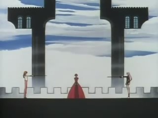 最初のカットは、樹璃下手=挑戦者・奪う者、ウテナ上手=主人公・守る者、アンシー中央=中立の存在・見とどける者、という3者の立場が、立ち位置によって示されている止めの一枚。