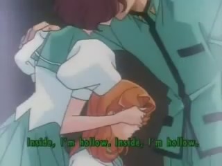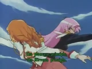 この猛攻の合間に、アンシーと、樹璃方過去の3人の一枚絵がインサートされるけど、3人の一枚絵のカットは、樹璃の左への運動方向にあわせてかなり高速で左へPANされる。そのすぐ次のカットで、髪の毛以外動かしてないセルをスライドのみで交差させ、効果音と撮影のみによって剣の交差と位置の交代を見せる。やはり位置の交代カットは毎回印象的にしてある。